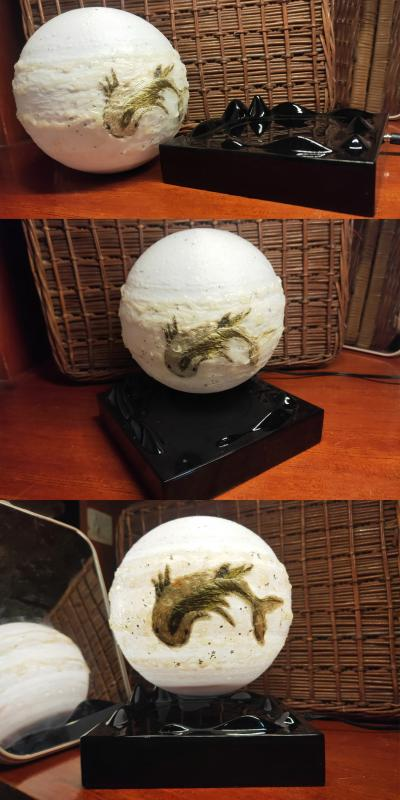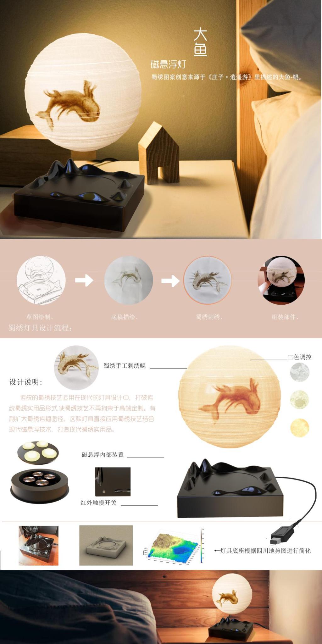 设计说明:大鱼灯具是一款以蜀绣技艺为核心的现代灯具。将蜀绣与家居产品灯具相结合,增加蜀绣在日常生活里的曝光度,让每个人都可以接触和使用蜀绣,促使人们有兴趣对蜀绣进行研究和探索实现对于蜀绣技艺的关注和保护。该产品主外观为磁力悬浮灯具球体和底座,底座有触摸开关具备三色控光功能。适合用户在不同场景使用。磁悬浮是该产品最主要的一个功能,只要接通上电源即刻悬浮起来,充满科技梦幻感的同时具有丰富的趣味性。灯具底座应用四川盆地群山环绕概念,展现出四川盆地四周山脉绵延起伏的壮阔景象。灯具运用蜀绣技艺绣制出的庞大壮观的鲲,可以近距离感受到中国蜀绣技艺的巧妙绝伦。