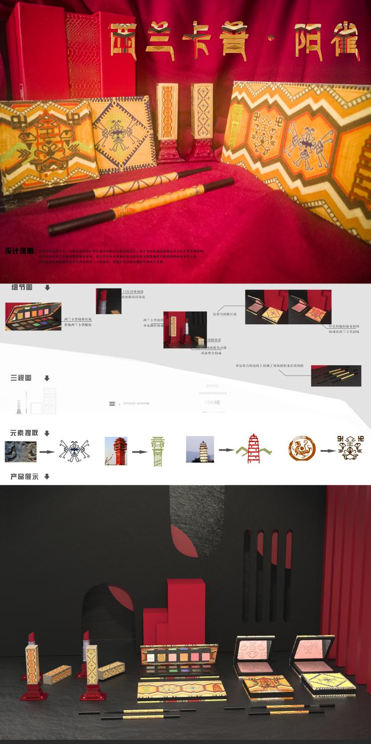 设计说明:民族美就是世界美,传统文化再设计理传递出民族自信和文化自信,对于中国化妆品品牌走出去有着重要的影响。结合达州本地土家族文化和地标建筑,设计出具有重要象征意义的民族文化精神符号的虎图腾和比翼鸟元素,加以抽象化凤凰楼和龙爪塔图案的西兰卡普纹样,展现具有达州本地特色的风土人情。