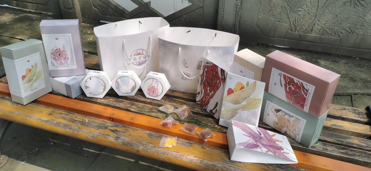 通过采用扁方盒,纸袋装,六边盒和独立小包装的分级包装的形式进行表现,笔者视觉化重构每一张塔罗图形与相对应的休闲零食进行包装设计,绘制出休闲食品的图案并与塔罗图案相协调,调整了一些色彩和细节。 “愚者”从开始到“世界”的结束经历了一个轮回,水果果干来到蔓越莓曲奇饼中进入了新世界。塔罗图形就像休闲食品一样,调剂着生活,为人们增添乐趣,使休闲食品包装设计更加多样化,体现塔罗图形的独特美,给消费者更多选择。