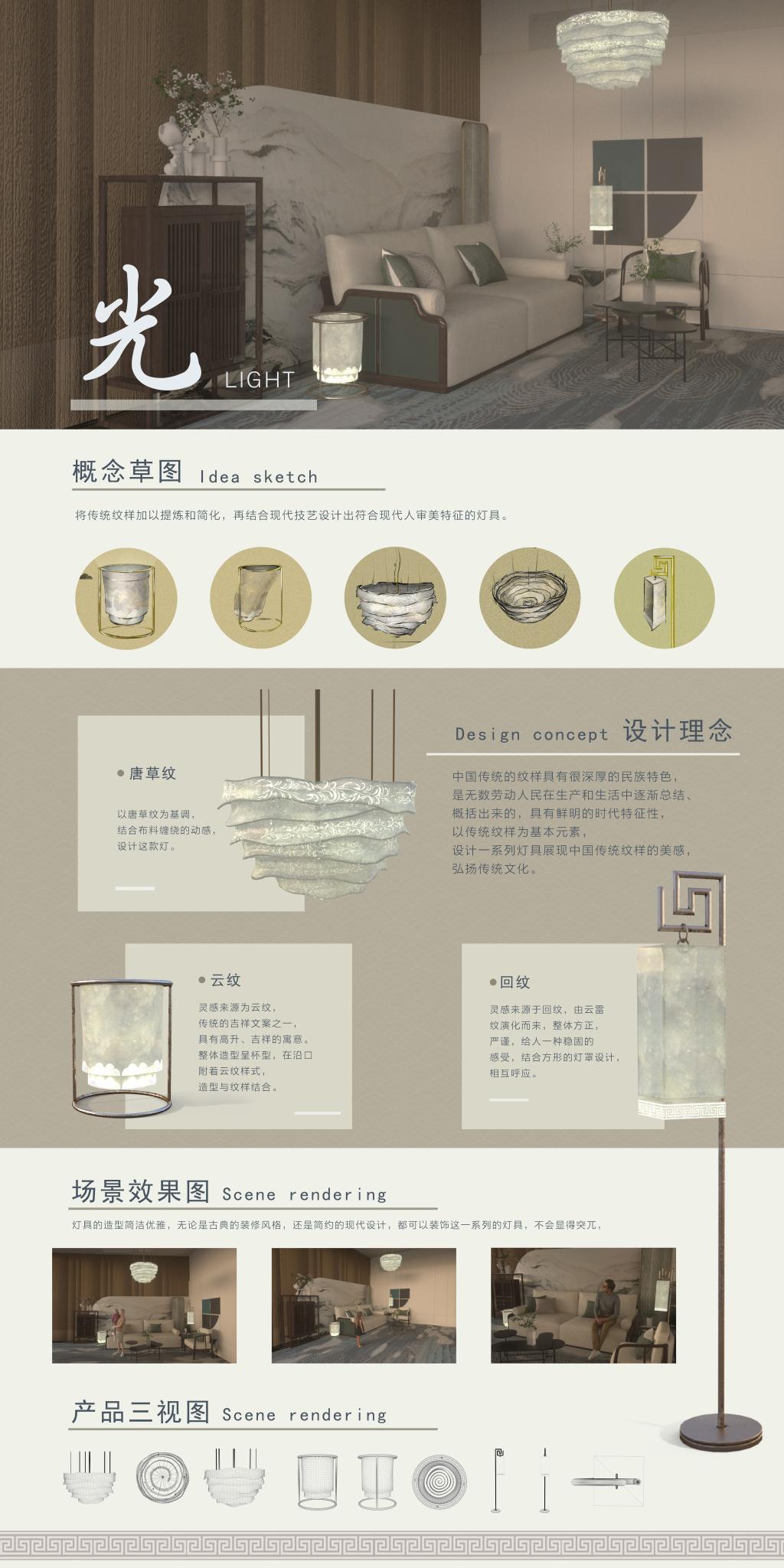 设计说明:中国传统纹样具有深厚的民族特色,是无数劳动人民在生产生活当中总结出来的,是中国民族的瑰宝。再将传统纹样提取出来,化繁为简,运用到现代灯具设计,以新的视角注入活力,使其更好地发展。