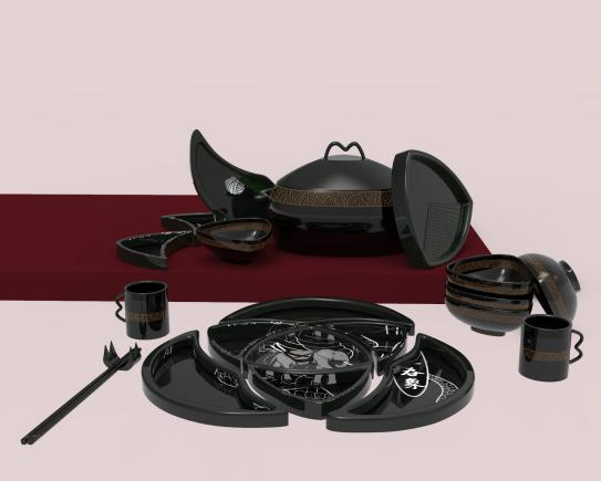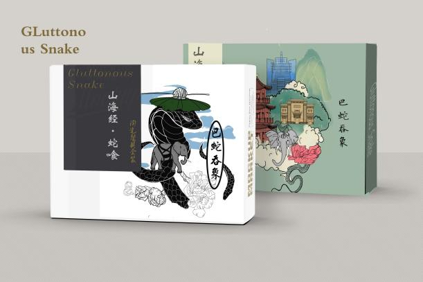 进行分析,对于餐具的造型上对蛇的攻击形态进行推演得出的几何造型。色彩与图案的设计上以《山海经·海内南经》记载“巴蛇食象,三岁而出其骨,君子服之,无心腹之疾。一曰黑蛇青首,在犀牛西。进行统一性的设计增强使用氛围感。