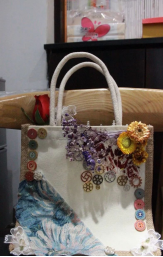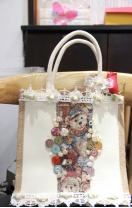DIY手工:用现有的贴纸,装饰小物以及布料进行组合,对帆布包进行手工改造做成自己想要的样子。