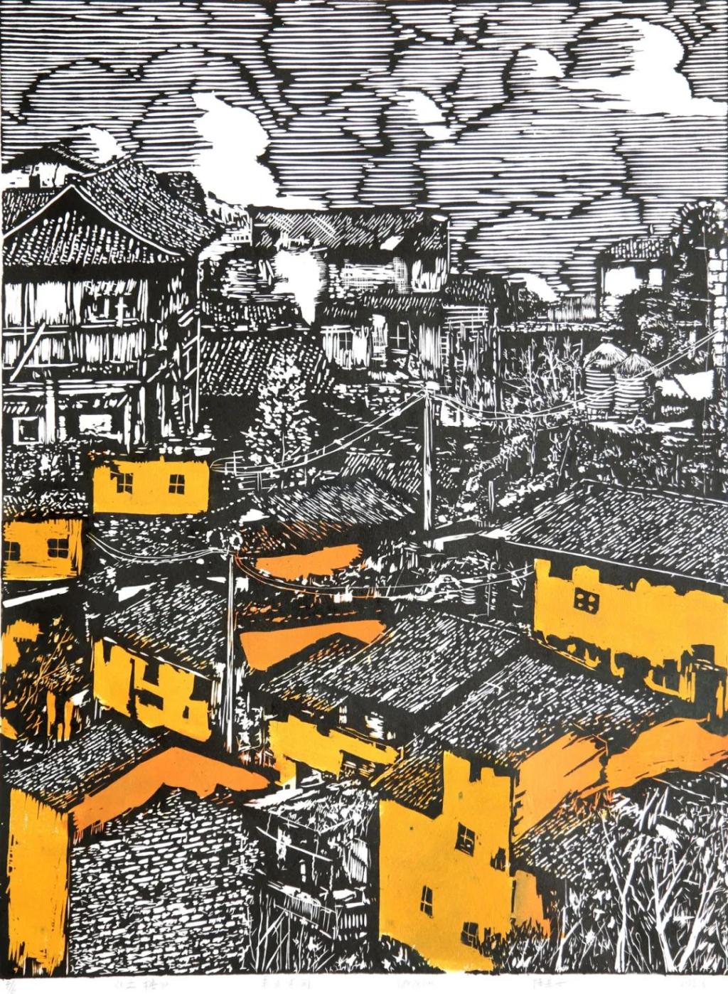 《土楼》 陈昱安 黑白木刻 58×78cm