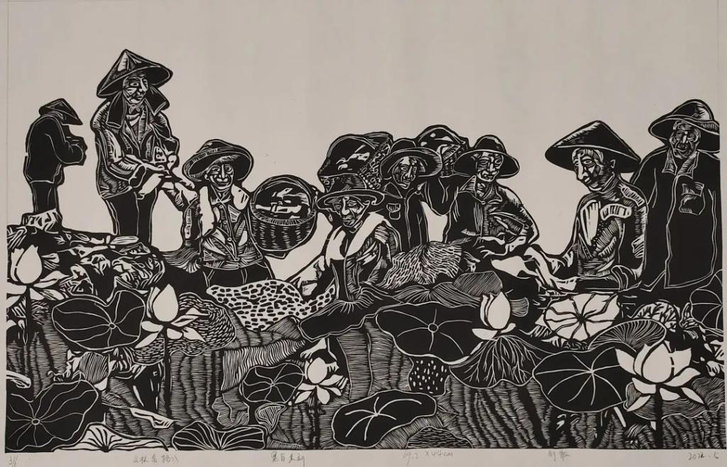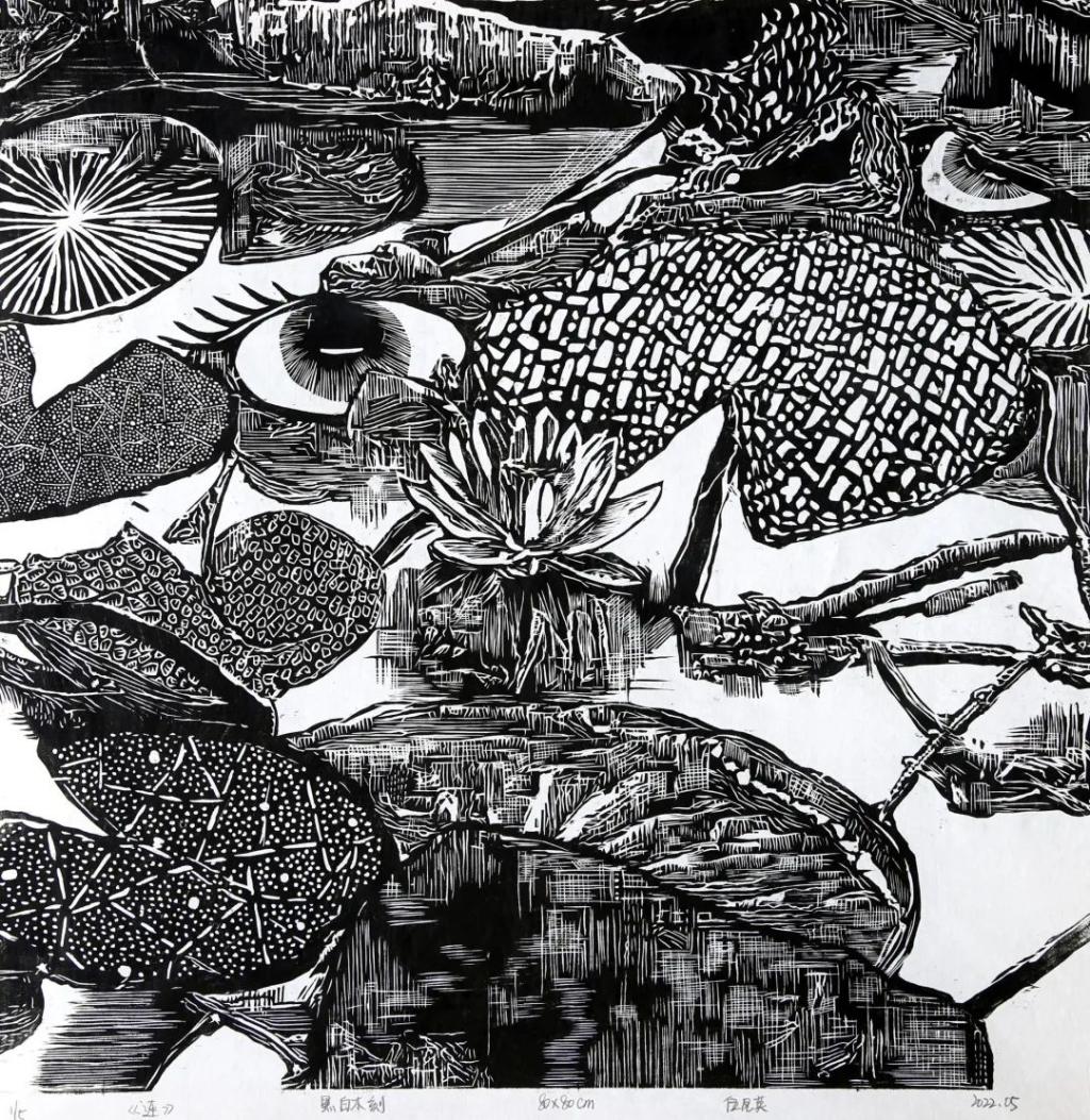 《莲》 伍凤英 黑白木刻 80X80cm