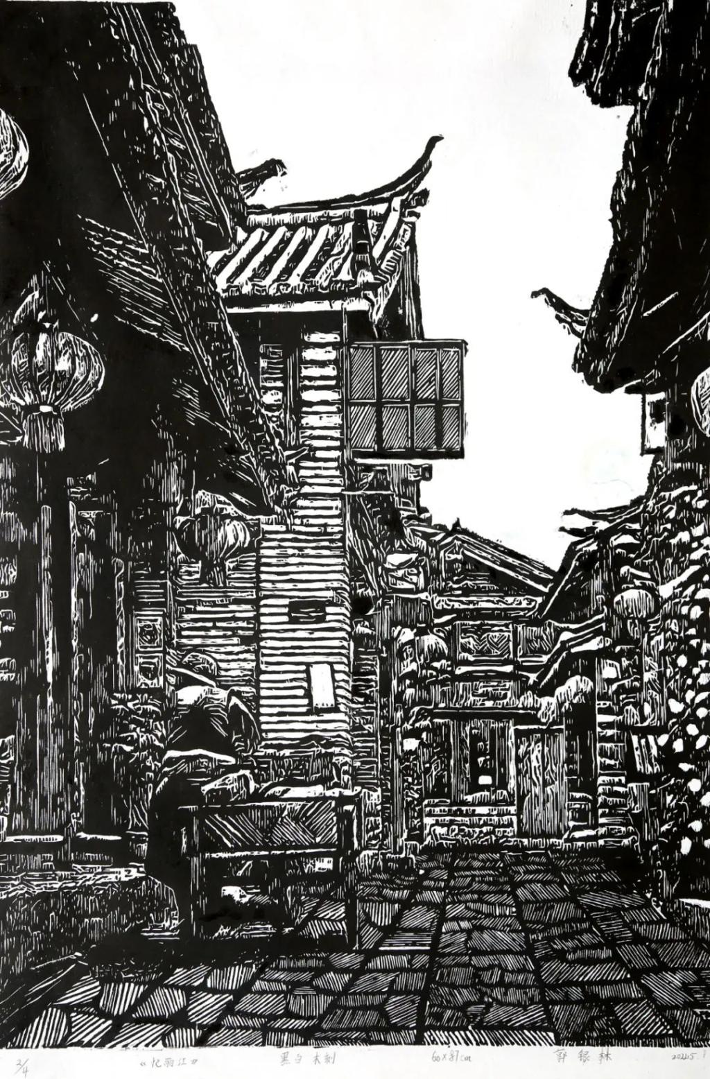 《忆丽江》 郭银林 黑白木刻 60x87cm