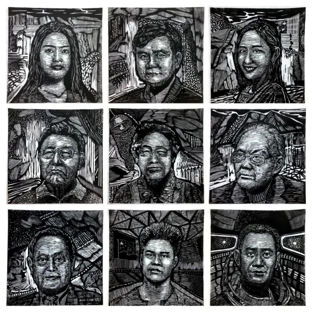 《时代楷模》谭慧芳 黑白木刻 150x150cm