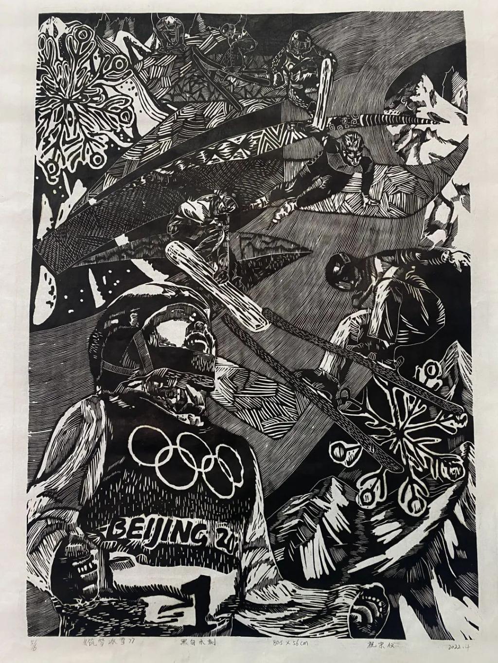 《筑梦冰雪》祝宗仪 黑白木刻 81x56cm
