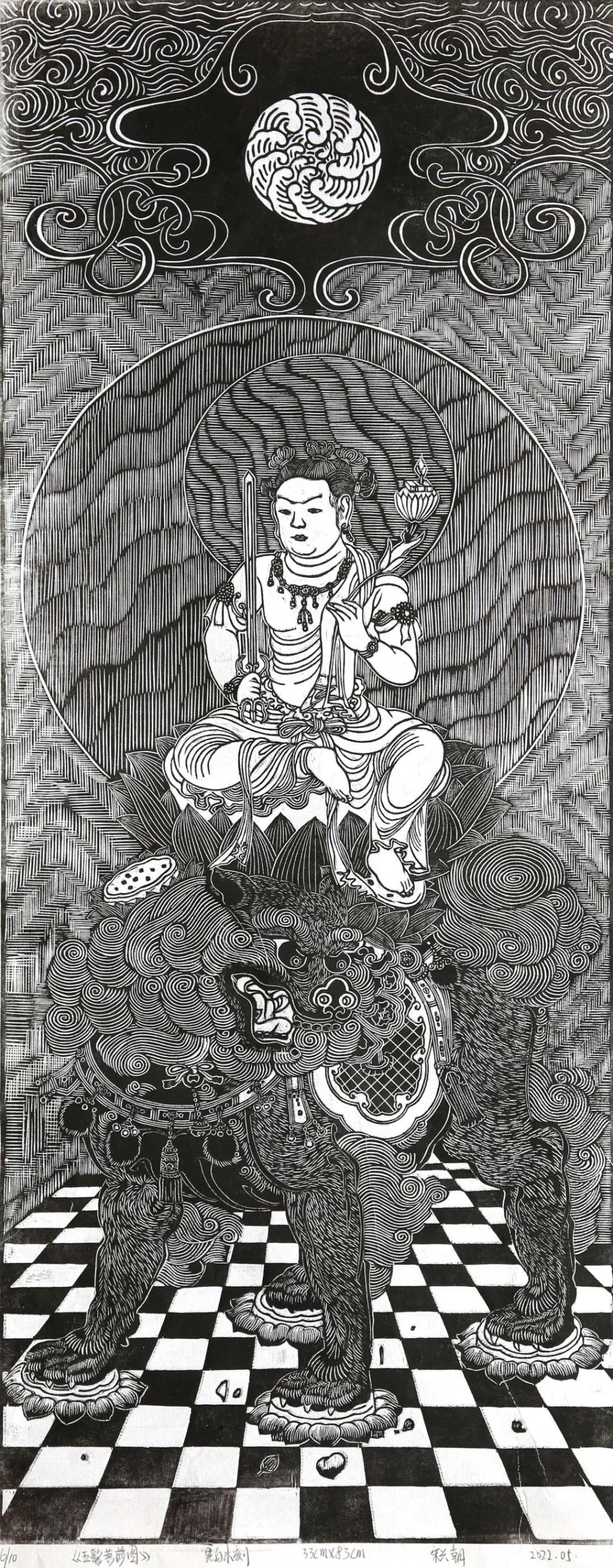《五髻菩萨图》 宋兴朝 黑白木刻 33x83cm