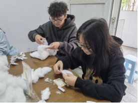 活动现场,指导老师王誉燃详细讲解制作流程,同学们积极参与、共同协作,纷纷拿起针线、布料和填充物等材料,开始了自己的玩偶制作之旅。同学们两两一组或三四成群,围坐在活动室的桌子旁,一边讨论着设计思路,一边动手制作着属于自己的玩偶。在制作过程中,室友们相互协作,共同商讨玩偶的样式、颜色和大小等细节。有的负责剪裁布料,有的负责缝制,还有的负责填充和装饰。大家分工明确,配合默契,整个活动室充满了欢声笑语和温馨的氛围。除了制作玩偶,同学们还利用这个机会交流了日常生活中的趣事和困扰。他们发现,原来彼此之间有着这么多的共同点和话题,这让他们更加珍惜这份难得的室友情谊。