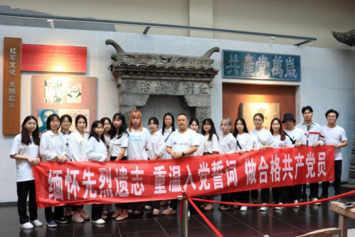 红军文化陈列馆的红军群雕前,黄崇岭老师带领毕业生党员,面向党旗庄严的重温了入党誓词,黄老师表示,我们在这里重温入党誓词,是对党员干部的一种鞭策和激励。