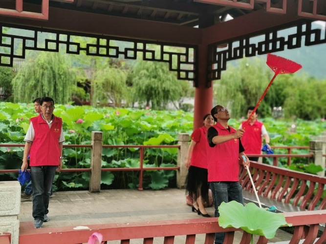 随后,党员同志冒着毛毛细雨,来到了公司翠柳湖畔,对翠柳湖长廊及碧玉亭的卫生进行了清扫和保洁。