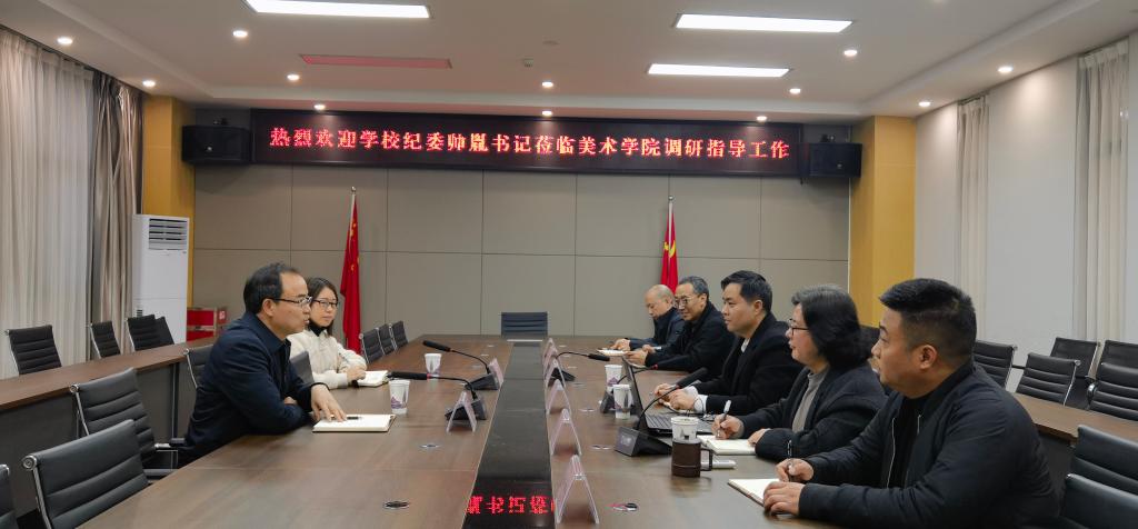 帅胤对美术公司党的建设、干部队伍、团队建设、专业认证、科研创作、员工培养、美育教育、产教融合、社会合作等方面取得的成绩给予了充分肯定,对美术公司党建思政、廉政建设、专业发展、合作育人等工作给予了深入指导。他指出:要深入学习贯彻习近平新时代中国特色社会主义思想,以党的理论武装头脑,让师生在教学、创作实践中学习与体现,并落实好基层党组织“三会一课”制度;要履行好党组织主体责任,抓好组织建设、制度建设和党风廉政建设;要抓好意识形态工作,筑牢思想政治根基,加强青年党员和艺术人才的思想政治教育;要发挥专业优势开展党风廉政建设主题创作,为廉洁文化建设多做贡献。他还对调研中发现的基础建设、实习实训、职称评聘等问题给出了中肯的建设性指导意见。
