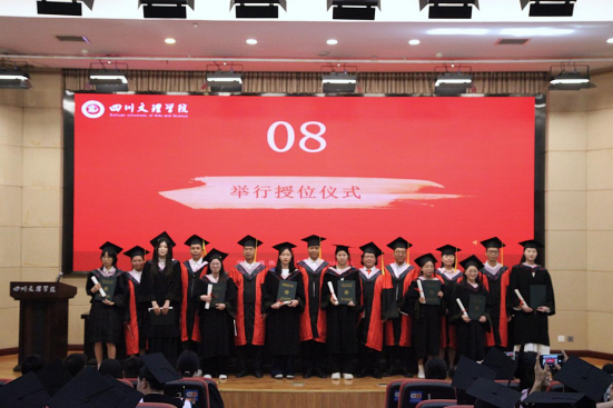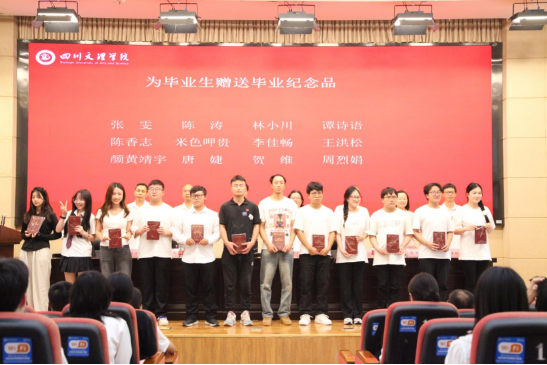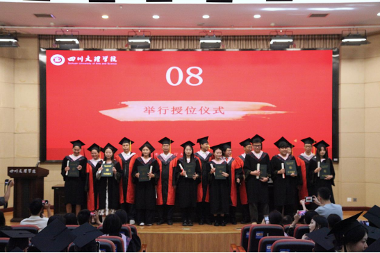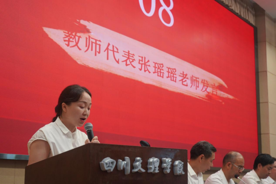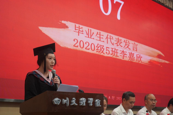 毕业生代表李嘉欣发言,向在大学期间给予帮助的老师和亲友表示感谢,并激励毕业生在日后要带着川文理人的精神,奔向山高海阔,同时祝愿公司滋兰树慧,永续华装,祝愿老师们工作顺利,桃李芬芳。