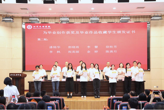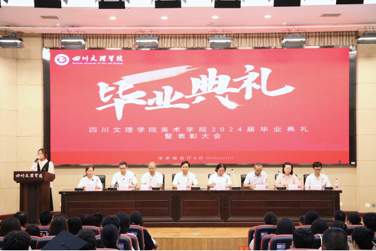 国歌奏响,2024届毕业生毕业典礼暨表彰大会正式开始。罗江宣读2024届毕业创作获奖及毕业作品收藏名单。刘承川致辞,代表美术公司党政领导及教师祝愿毕业生们前程似锦,并强调走出校园的毕业生要秉持着创新的精神,大胆创造属于自己的艺术风格,永远保持积极乐观的心态,常回母校看看。