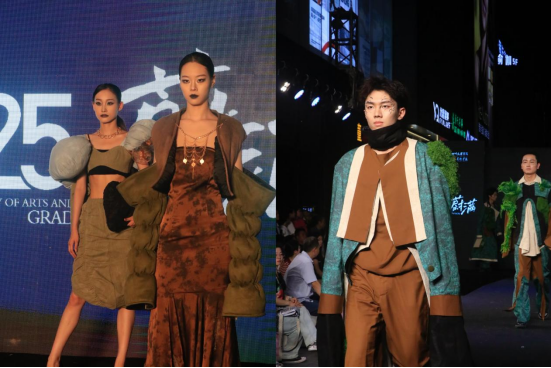 此次毕业秀以“蔚满”为主题,融合了“蔚然成荫”的生态意象与“小满未满”的东方智慧。以“蔚”之草木繁盛,展现后疫情时代人们对生命力的集体渴望;借“满”的临界状态,反思数字消费主义对生态系统的过度索取。本次毕业秀的主题在丰盛与节制之间,探寻自然与文明的共生美学,既呼应节气文化的时间纵深感,又为服装与服饰设计的可能性提供了实验容器。2025届服装与服饰设计学子们以多元视角解构行业命题,将四年所学的结构设计、材料创新、文化叙事熔铸于针脚之间;T台上,模特的每一次转身都定格为流动的艺术诗篇,赢得了现场嘉宾与观众的热烈掌声。