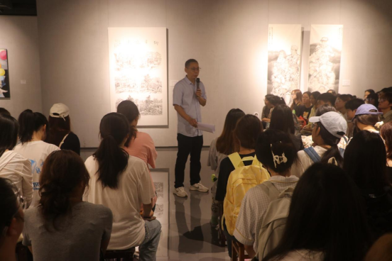 美术馆内,公司副经理吴仕华教授围绕“夯实造型基础与探索媒介创新”和“扎根生活观察与传递人文温度”展开讲解。他强调,同学们应在筑牢传统美术根基的基础上,积极拥抱数字绘画、综合材料等形式,实现创作语言的多元拓展。同时,他鼓励大家深入生活、关注社会,使艺术创作既体现专业水准,又承载人文关怀,真正实现“艺术为人民服务”。