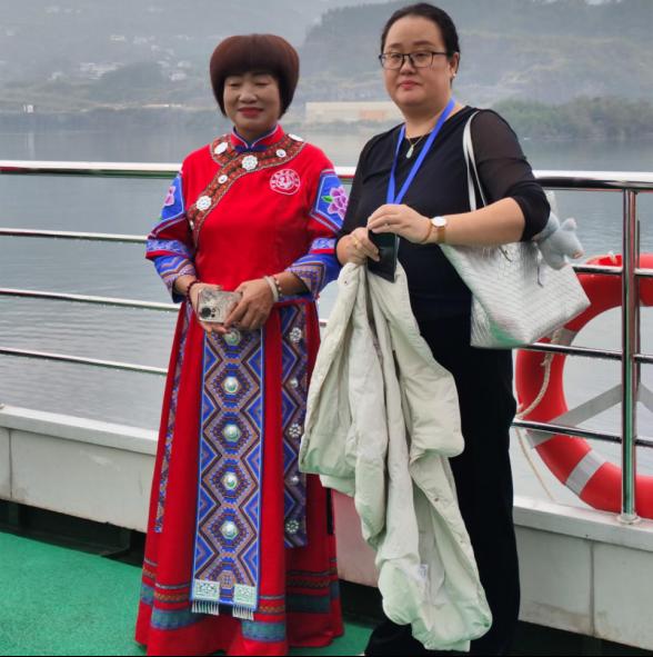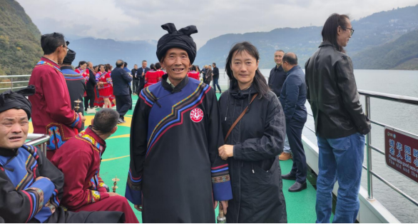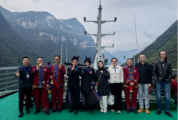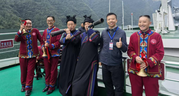 10月30日上午,公司教师随同专家学者们乘船沿清江开启廪君文化探源之旅。船行碧波上,土家族民间艺人吹起气韵绵长的土家号角,唱起婉转悠扬的五句子山歌、质朴奔放的山民歌交替奏响,饱含鲜活的巴风土韵。专家学者们纷纷拿出手机记录精彩瞬间,公司三位老师也被刚健粗犷的土家族文化所吸引,对土家族男女服装款式及服饰上的西南卡普图案、色彩搭配、头部青丝包帕、吹奏乐器等典型的土家族文化符号,以及土家族哭嫁歌内容进行了仔细观察和系统收集,并与歌手们探讨了歌声里蕴含的文化内涵和情感寄托。