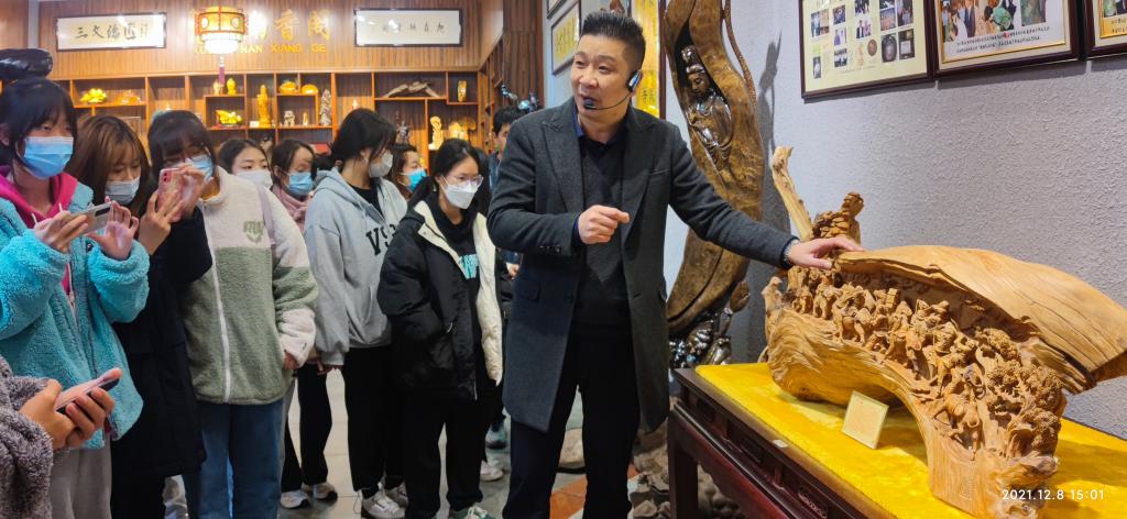 本次课程邀请了木雕艺术设计师牟洪波老师为同学们讲解关于木雕雕刻的技巧和其他的专业知识。首先,牟洪波老师为我们讲解了楠香阁的布局并带我们参观了许多的木雕作品,其中最让人印象深刻的作品就是《金丝楠木丝绸之路》、《巴人故里》,这两个作品是以金丝楠木为材料打造的作品,不仅弘扬了中国优秀传统文化,更体现了追求卓越、精益求精的中华民族工匠精神。同时,牟洪波老师还带领同学们参观了由楠香阁收藏的茶器和汉砖,这些传统的文化象征在橱柜中依旧熠熠生辉,让人不禁感叹到中华民族传统文化的魅力。最后,牟洪波老师为同学们讲解了综合材料课程的创作技巧与心得,给同学们带来了生动愉快的一课。
