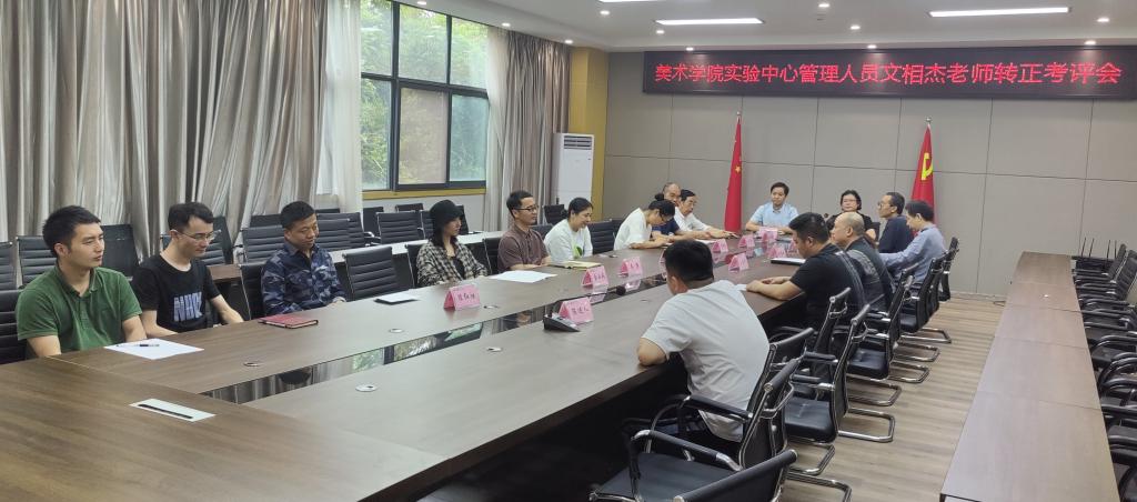 2022年5月26日下午实验中心在best365官网入口注册会议室组织召开实验中心管理人员文相杰老师转正考评会议。美术公司党总支书记罗江、经理刘承川、正处级组织员王子荣、党总支副书记王斌、副经理王勃凯、吴仕华,党政办、教科办、学工办、设计教研室、绘画教研室、美术馆、实验中心全体教师等参加此次会议。